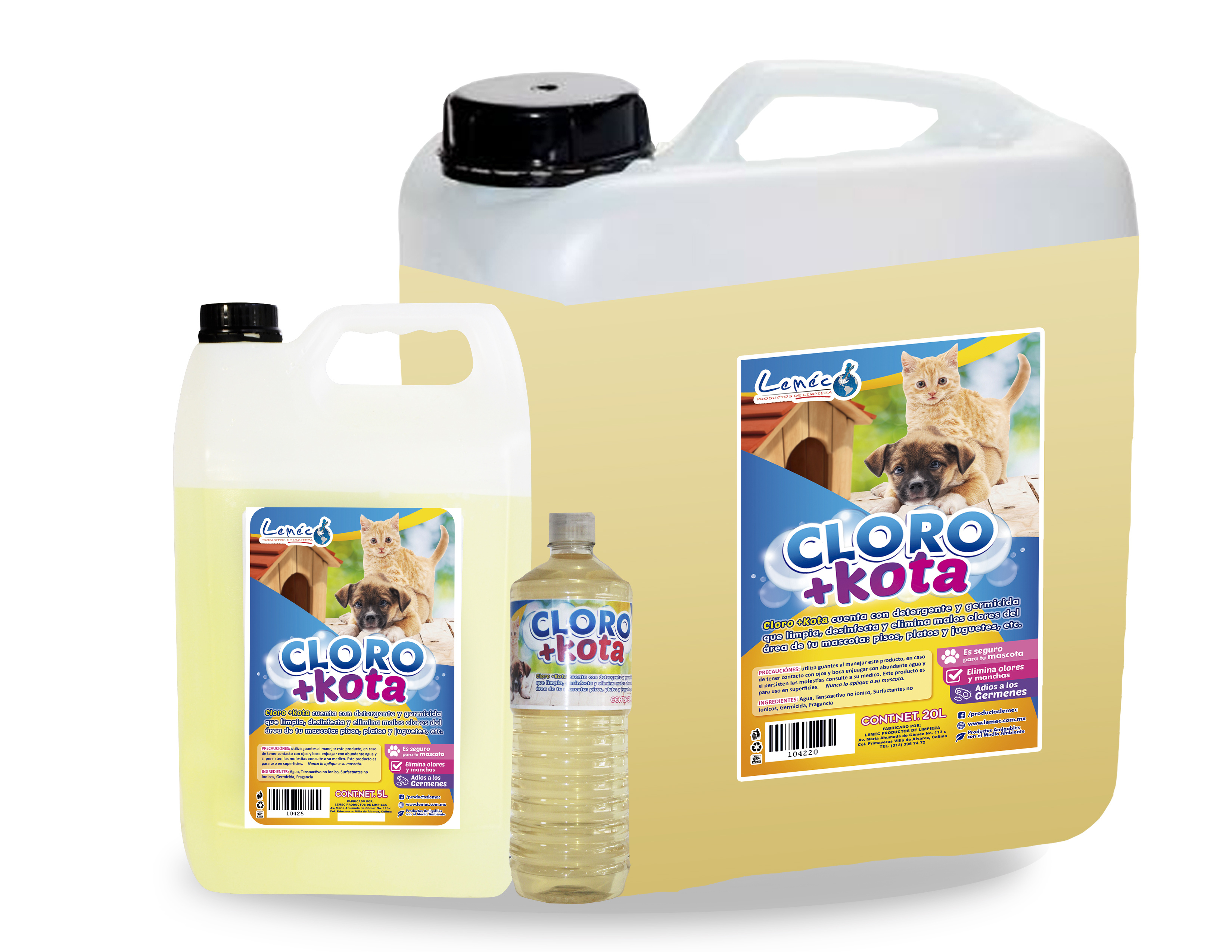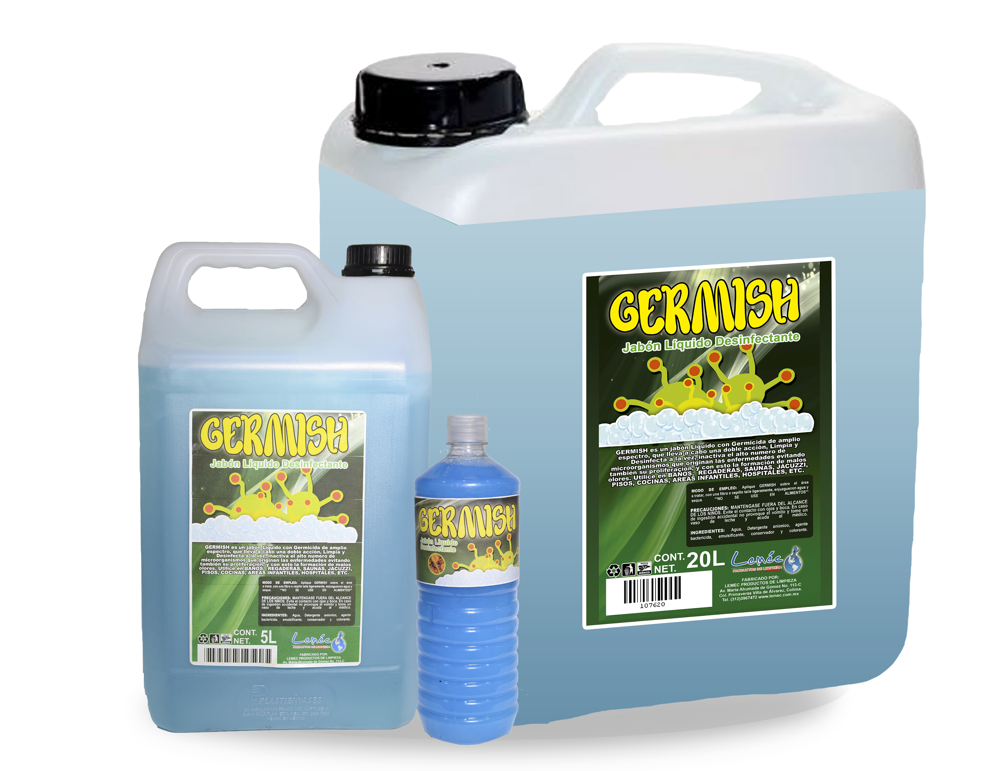 Líquido con detergente y germicida, que limpia y desinfecta.